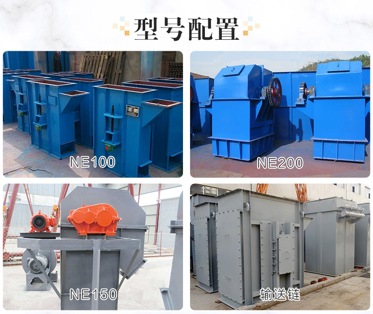 散裝物料板鏈斗式提升機擁有大小不同的11種型號以及不同配置,型號有NE15、NE30、NE50 、NE100、NE150、NE200、NE300、NE400、NE500、NE600、NE800等,不同大小型號的提升機配置(料斗、鏈條、振動電機)選用的都不同所以價格也會有所不同,提升產量越大所選擇的料斗規格與電機功率也就越大。
