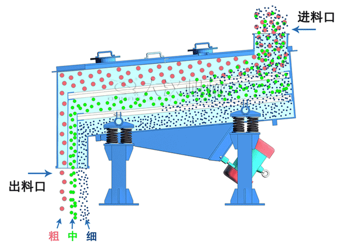 石英砂篩分機利用振動電機激振作為振動源,使物料在篩網(wǎng)上被拋起,同時向前作直線運動,物料從給料機均勻地進(jìn)入篩分機的進(jìn)料口,通過多層篩網(wǎng)產(chǎn)生數(shù)種規(guī)格的篩上物、篩下物、分別從各自的出口排出